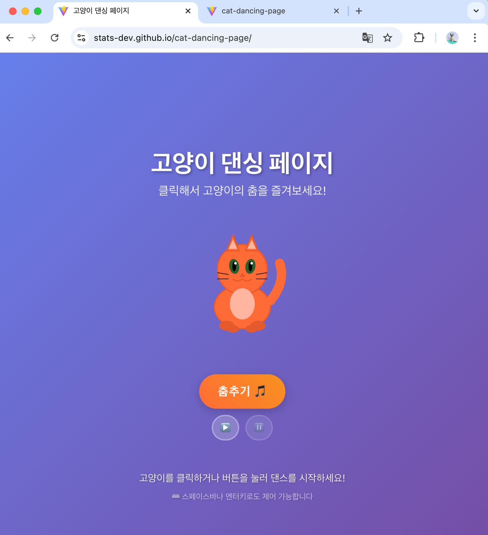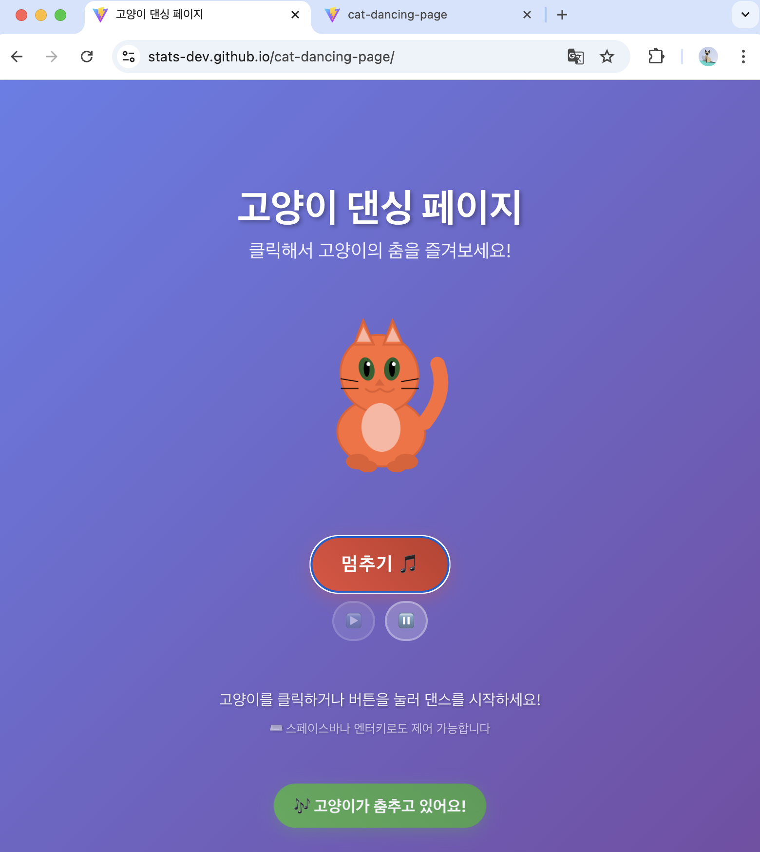 이제 https://stats-dev.github.io/cat-dancing-page/ 이 사이트로 접속해보니 아래와 같이 나타납니다.