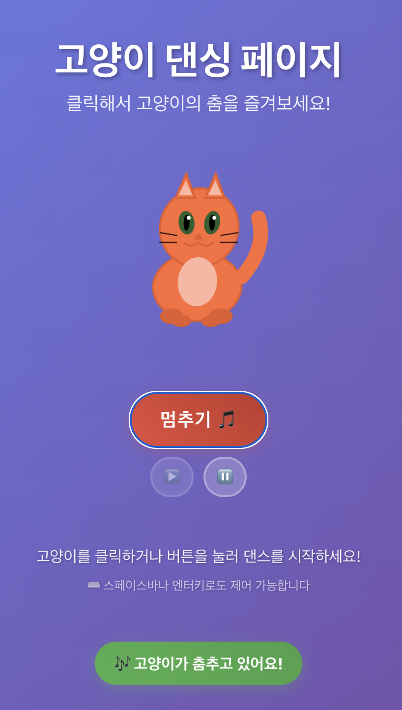 춤추는 고양이 화면이 잘 나타납니다. 춤추기 버튼을 누르면, 움직이는 고양이를 확인할 수 있고, 스페이스바나 엔터키로도 춤추기, 멈추기를 변경하며 작동이 가능합니다.