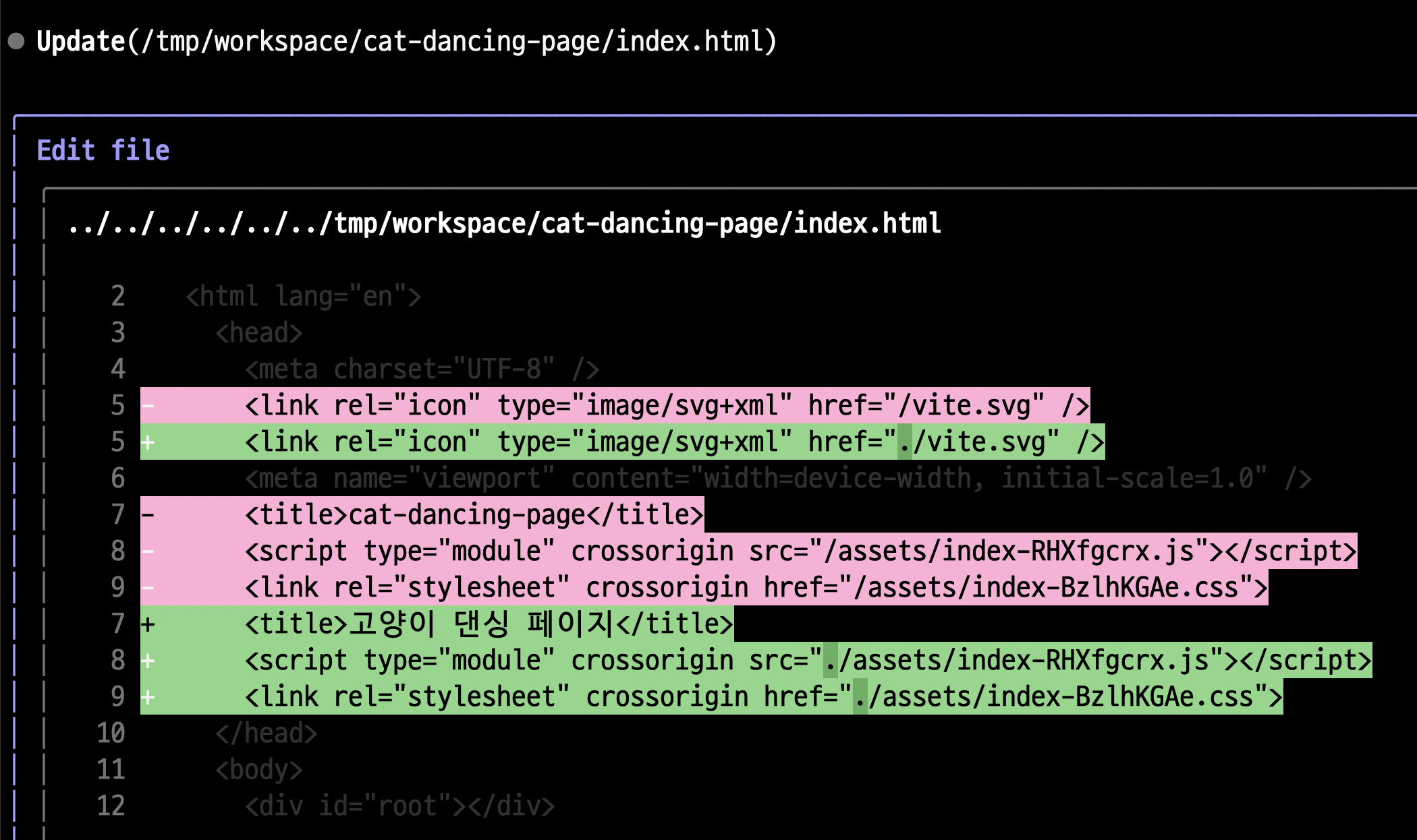index.html 파일 내에 있는 절대 경로를 상대 경로로 수정합니다. 내부 파일도 변경 사항을 잘 보여주네요.