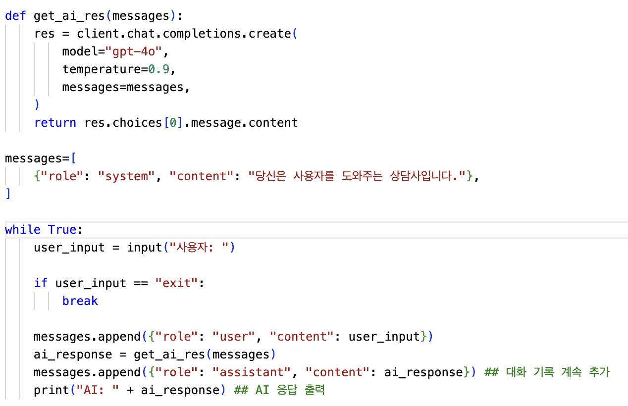 해결방법은 GPT 생성한 답변을 그대로 다시 메시지에 추가하는 것입니다. 함수를 하나 추가하고, while 문 하단에 messages라는 리스트에 추가하도록 append 문을 사용합니다.