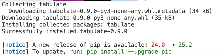이제 tabulate 설치가 완료되었고, 다시 실행합니다.