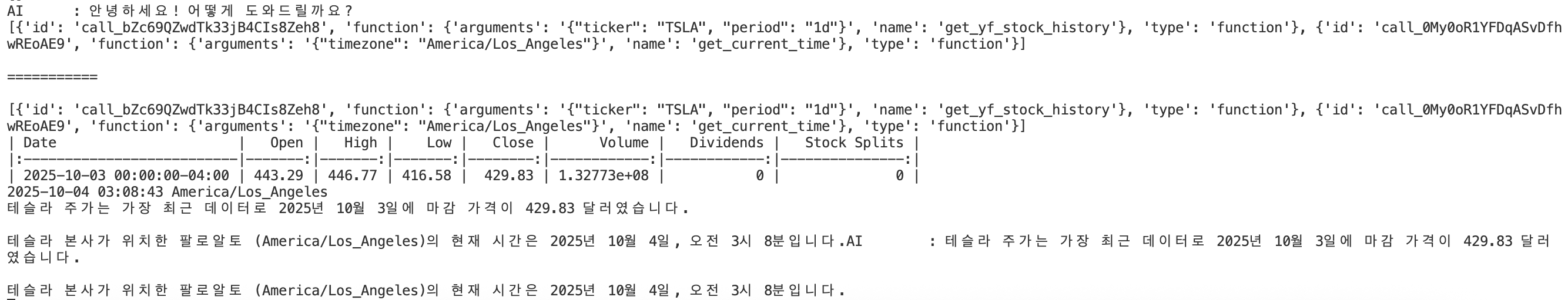 [{'id': '**', 'function': {'arguments': '{"ticker": "TSLA", "period": "1d"}', 'name': 'get_yf_stock_history'}, 'type': 'function'}, {'id': 'call_0My0oR1YFDqASvDfhwREoAE9', 'function': {'arguments': '{"timezone": "America/Los_Angeles"}', 'name': 'get_current_time'}, 'type': 'function'}]
