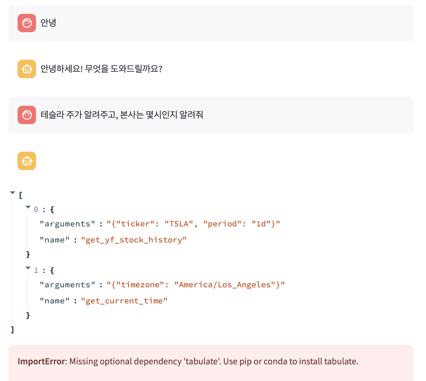 이렇게 잘 함수가 출력되고, 그 펑션 콜링을 바탕으로 아래 답변이 나타나는 것을 알 수 있습니다.