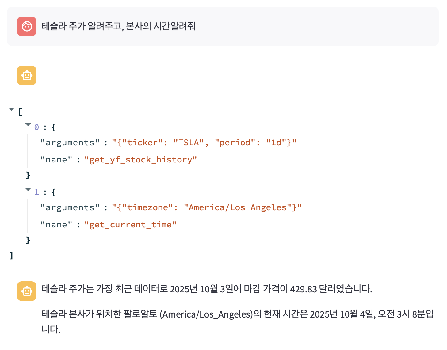 아래와 같이, 펑션 콜링을 수행할 때, 함수가 잘 나오고 그 뒤에 답변이 나타나는 것을 알 수 있습니다. 어느 함수를 사용했는지 이 빈 칸에 넣게 됩니다.