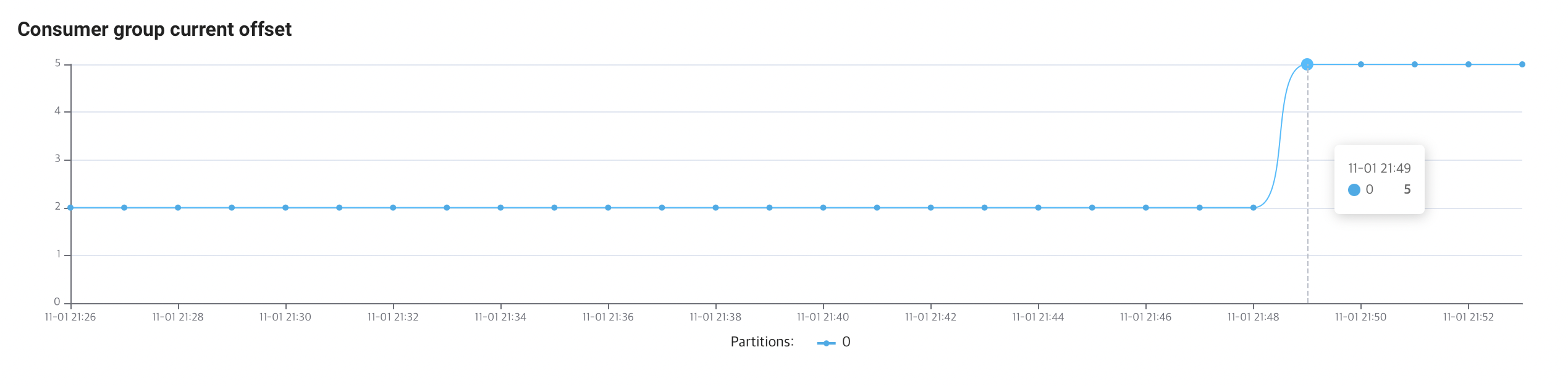 다음으로 콘솔 > 컨슈머 그룹 탭에서는, 현재 오프셋도 2개(0,1)에서 5개(0,1,2,3,4)로 증가한 것을 시각적으로 확인할 수 있습니다.