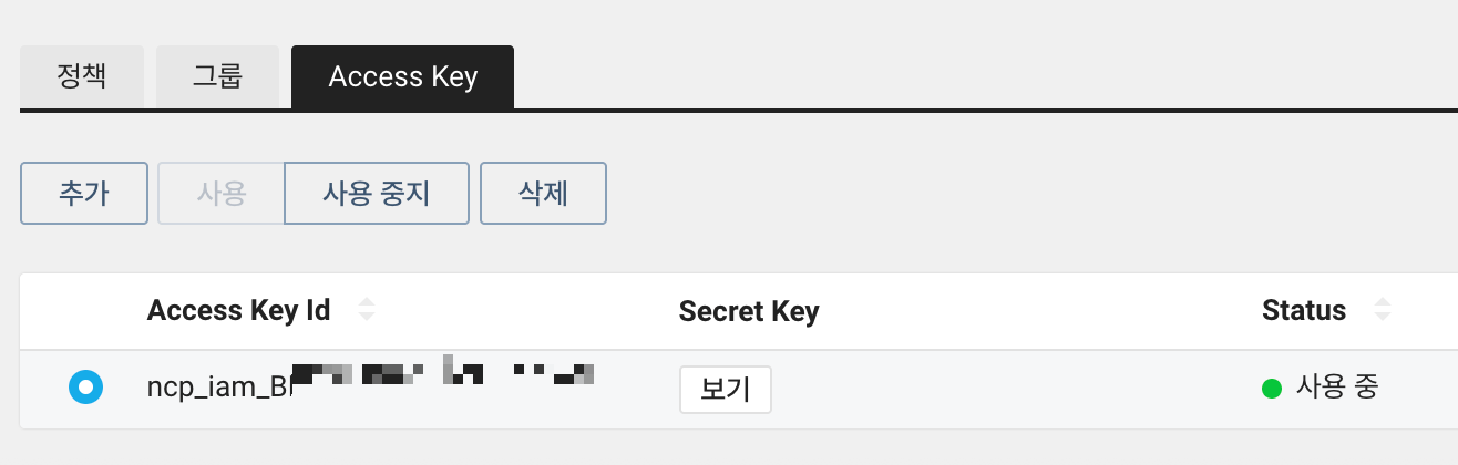 다음으로, 인증키 정보를 가져오겠습니다. Access Key 탭에서 추가를 눌러줍니다. 해당 서브 계정의 인증키 정보가 나오는데, Access Key id, Secret Key 정보를 메모해두세요.