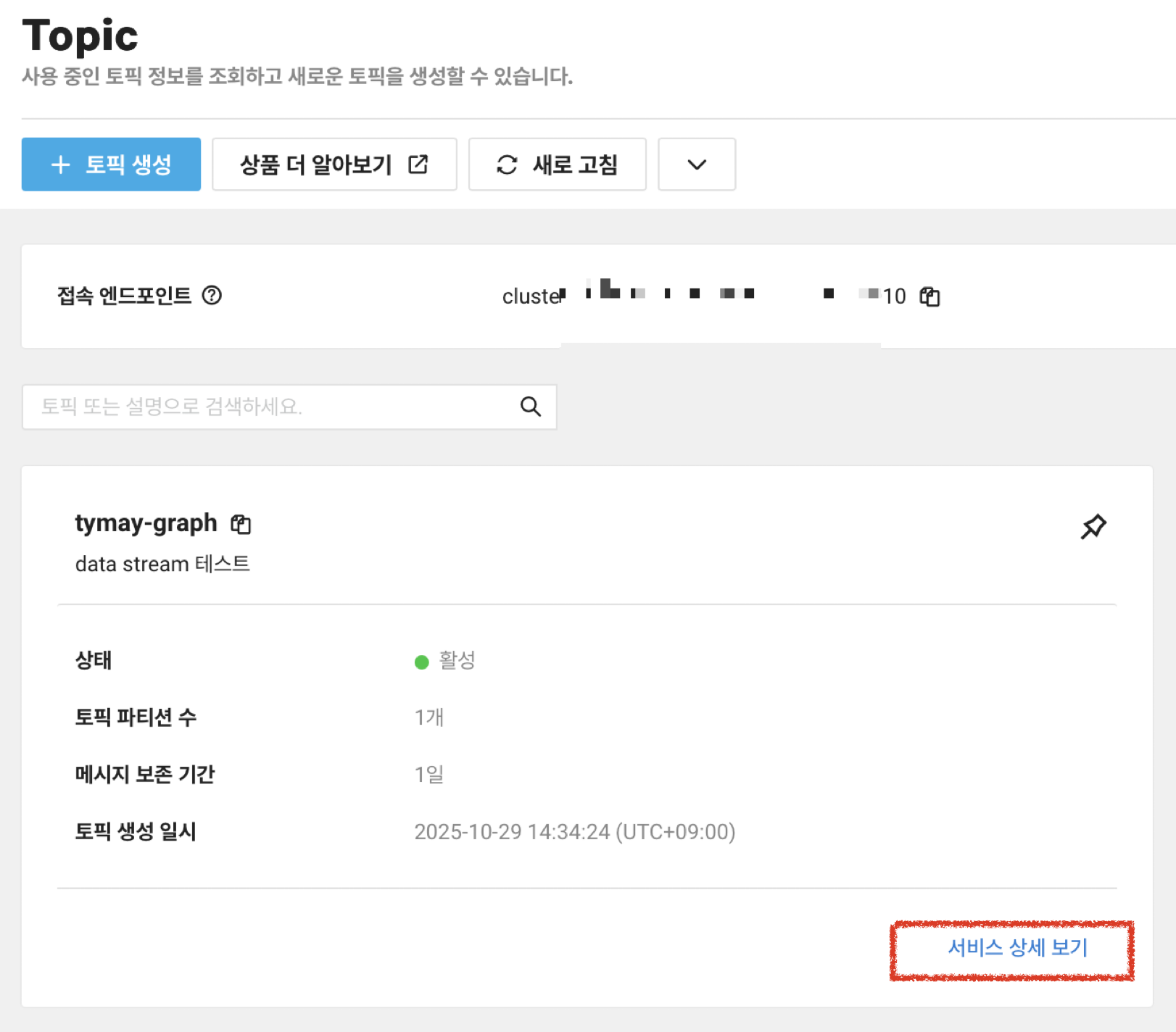 토픽 이름, 접속 엔드포인트를 복사해둡니다. 참고로 제 토픽 이름은, tymay-graph 네요.