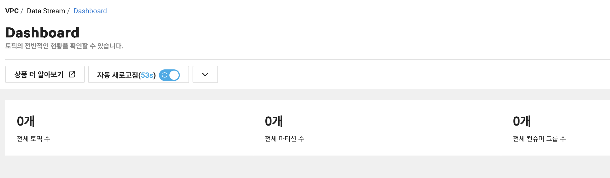 Data Stream 서비스는 별도 신청과정이 없습니다. 토픽을 생성하기 전에는 요금 부과도 되지 않고, 위처럼 대시보드에서 토픽, 파티션, 컨슈머 그룹 수가 0개인 것을 한눈에 확인할 수 있습니다.