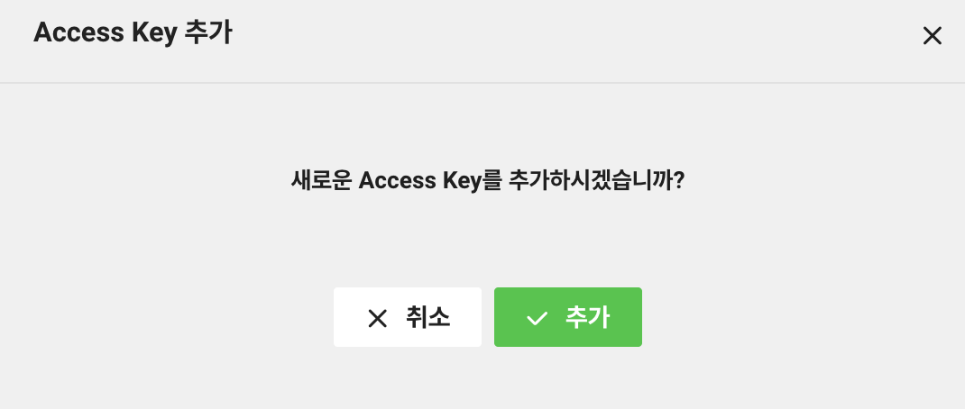 다음으로, 인증키 정보를 가져오겠습니다. Access Key 탭에서 추가를 눌러줍니다. 해당 서브 계정의 인증키 정보가 나오는데, Access Key id, Secret Key 정보를 메모해두세요.