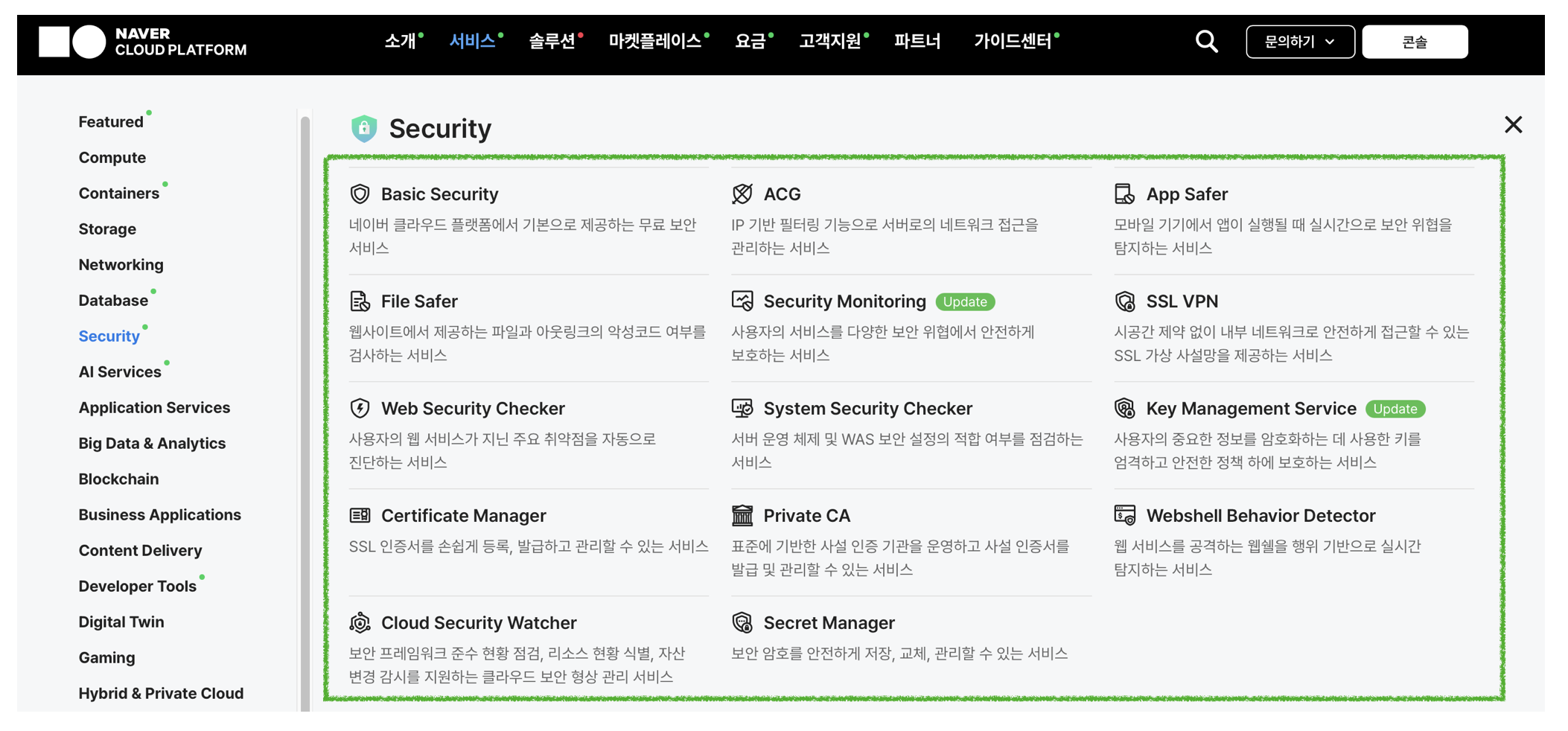 네이버클라우드 보안 상품은 Ncloud 홈페이지 > 서비스 > Security 카테고리에서 확인할 수 있습니다.