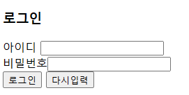 폼(form) 태그는 회원가입, 로그인, 회원 정보, 주문 페이지 등 다양한 곳에 활용됩니다. 아래는 로그인 페이지를 만들어 본 것입니다. 폼의 동작 방식을 로그인으로 알아보겠습니다.