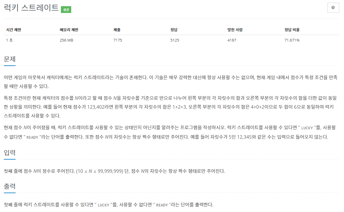 점수 N이 주어지고, 이를 반으로 쪼개어 첫번째 요소의 자릿수 합과 두번째 요소 자릿수 합이 일치하면 “LUCKY”, 아니면 “READY” 출력한다.