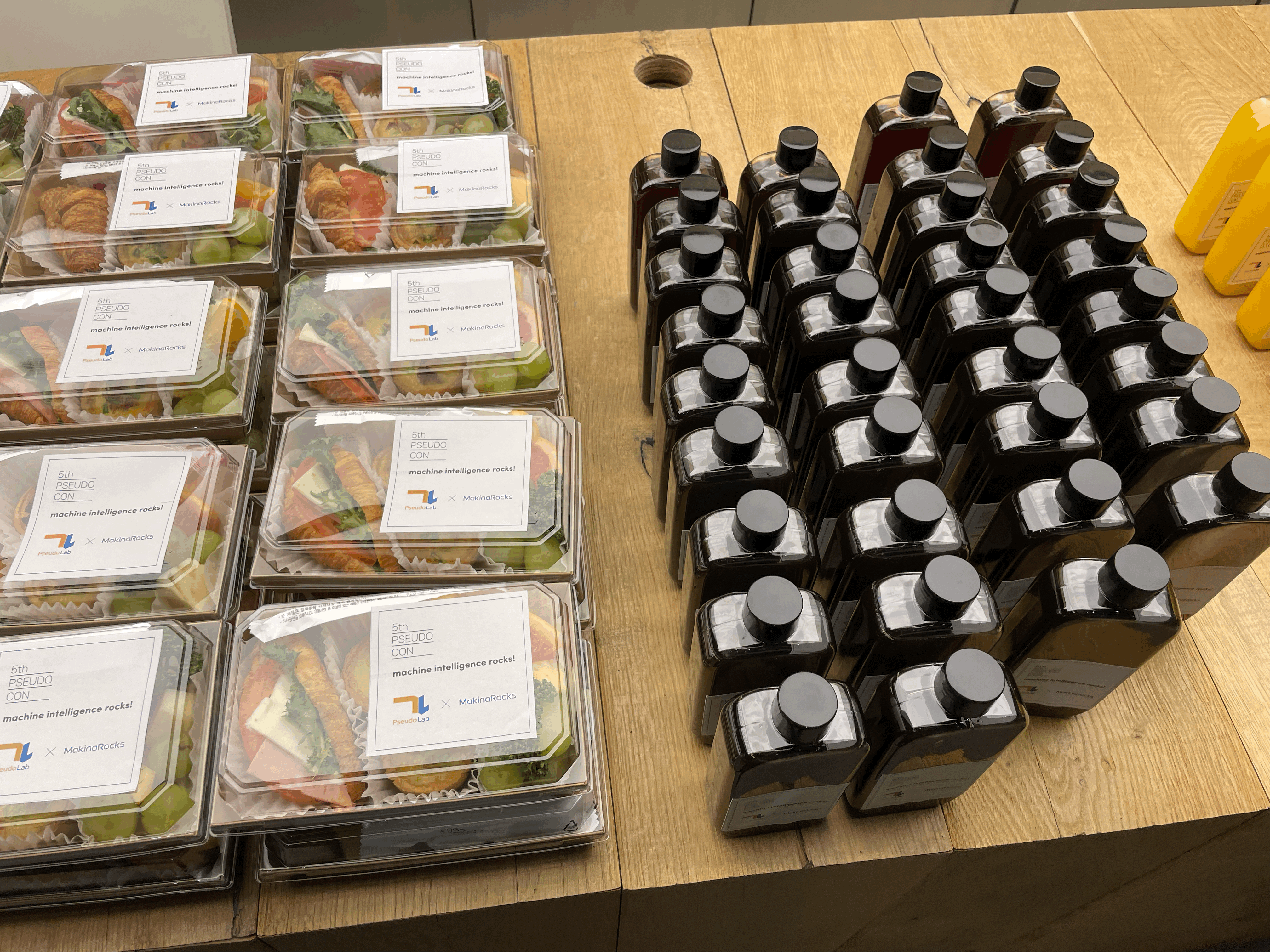 후원해주신 마키나락스 사의 도시락과 커피, 그리고 가장 오른쪽에 노란 병은 오렌지주스이다. 가운데 검은 것이 포도주스로 알았으나, 커피였다. 카페인에 민감한 친구라, 나중에 커피는 앞에 팻말을 두면 좋겠다.