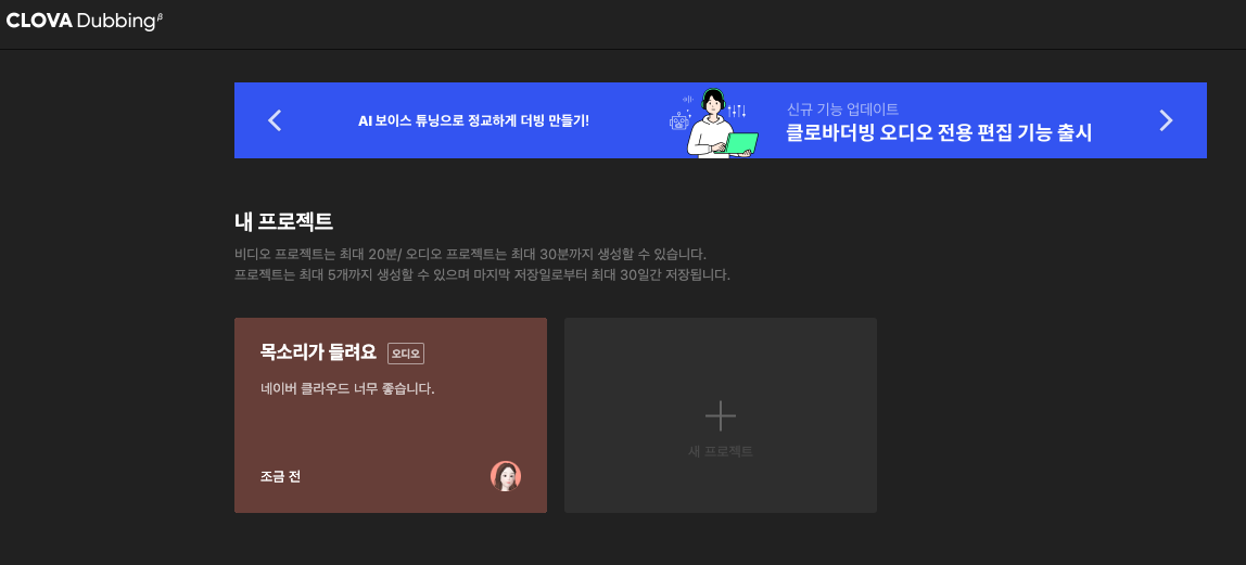 새 프로젝트를 생성해봅시다. 비디오는 최대 20분, 오디오는 최대 30분 생성할 수 있다고 합니다. 오디오만 사용한다면 30분까지 더빙이 가능하겠네요.