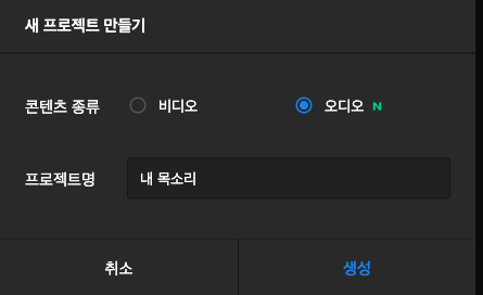 오디오로 선택해주시고, 프로젝트 명을 간단히 입력해줍니다.