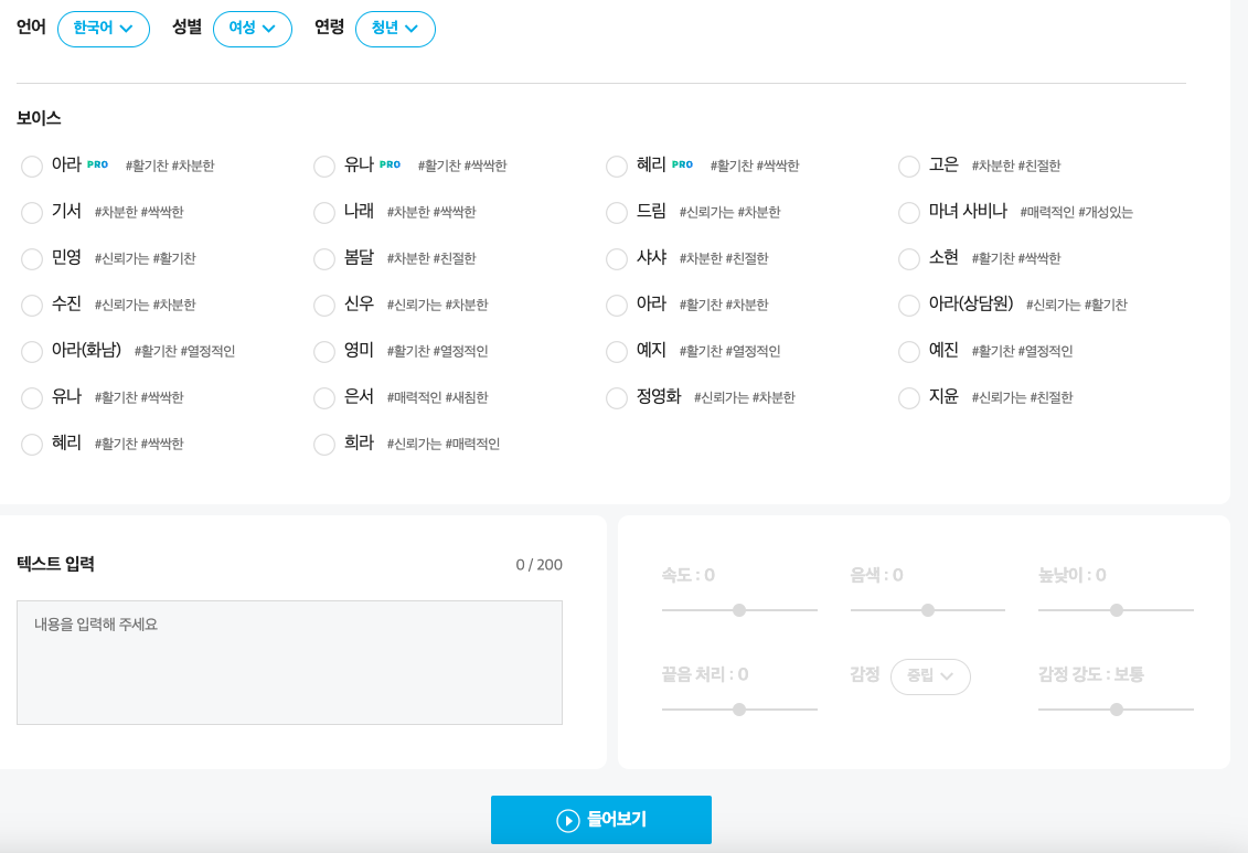 | emotion | Integer | 음성 감정 - 0에서 3 사이의 정수 값(0: 중립, 1: 슬픔, 2: 기쁨, 3: 분노) - 지원하는 목소리 : nara, vara, vmikyung, vdain, vyuna |
