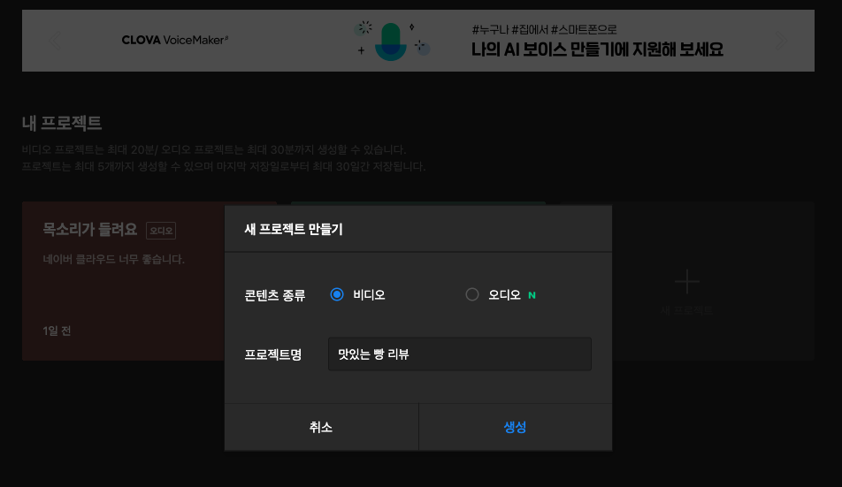 이 클로바 더빙 무료 서비스는 베타 버전으로, 정식 출시된 서비스는 아닙니다. 차후 공개가 되면 더 나아지겠죠? 먼저 무료로 시작하기 버튼을 눌러줍시다. 그러면 아래처럼 새 프로젝트를 만들 수 있고, 비디오로 선택해서 생성 버튼을 누릅니다.