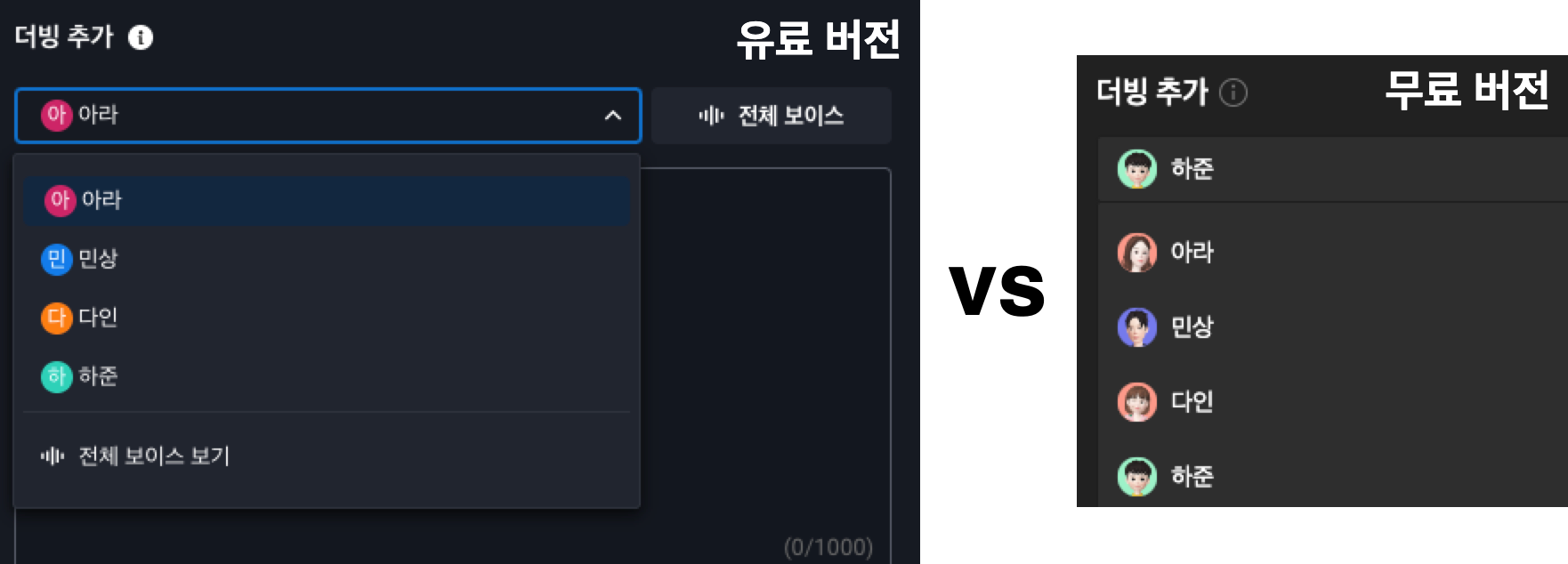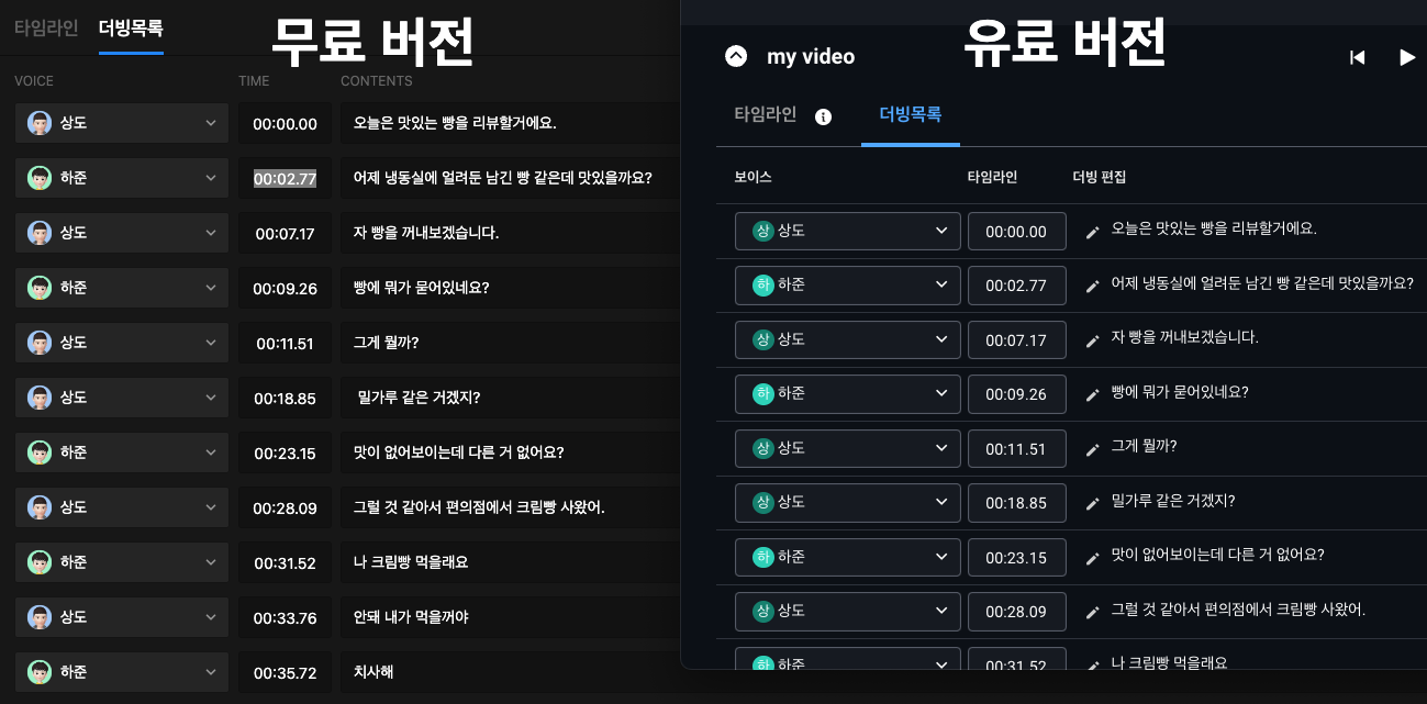 바로 차이가 보이십니까? 더빙 추가를 보면, 기존(무료 버전)에는 멋진 AI 화자의 모습을 프로필로 넣었다면 여기서는 첫글자만 프로필로 나타납니다. 유료 버전이 좀 업데이트가 느리다는 게 아쉽긴 하지만, 무료 버전은 아직 베타 버전이므로 아직 적용되지 않았다고 생각합니다. 따라서, 정식 출시하게 되면 이런 부분도 차후 업데이트로 개선될 것이라 생각합니다.