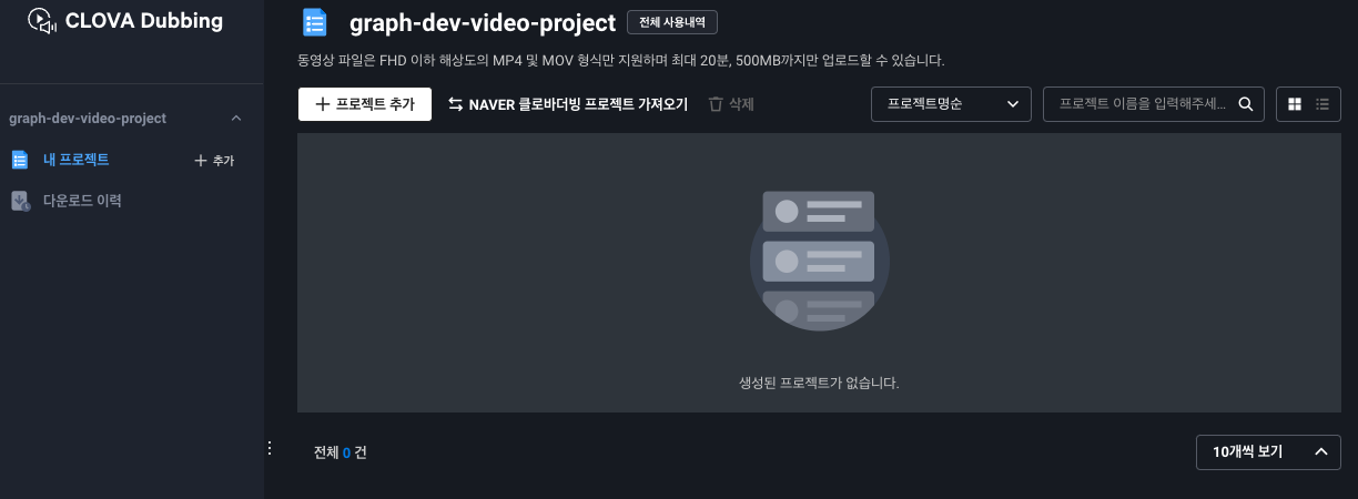 바로가기를 눌러주면 아래와 같은 프로젝트, 다운로드 이력을 확인할 수 있는 부분이 나타납니다. 프로젝트 추가를 누릅시다.