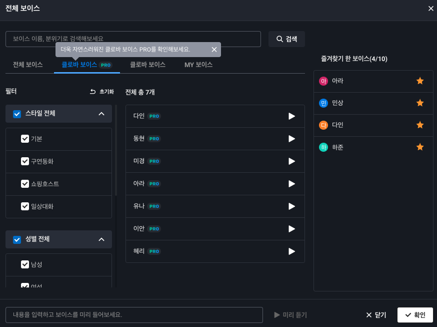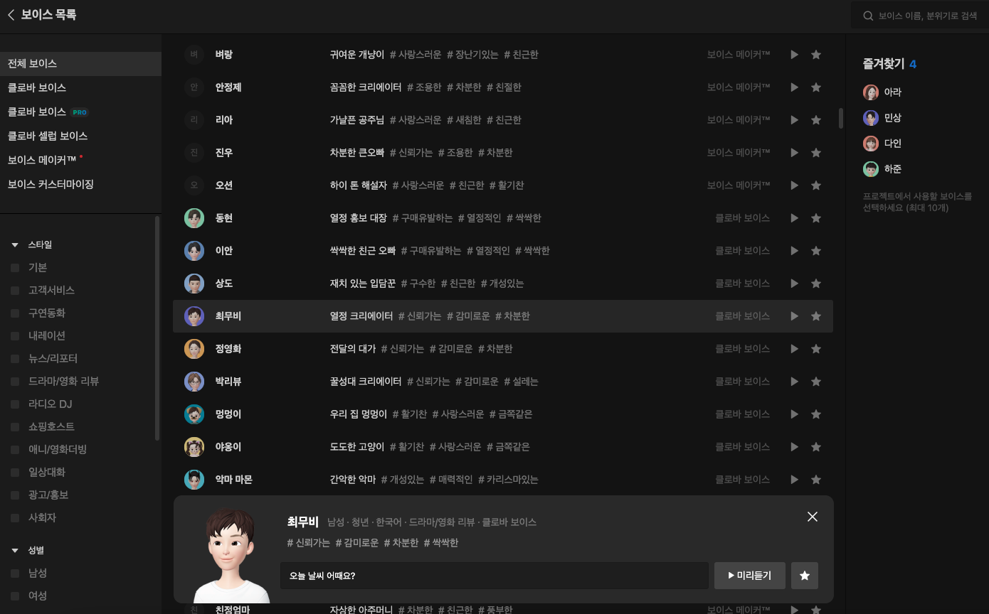 한번 전체 목소리도 살펴보겠습니다. 매우 다양한 목소리가 있고 한번씩 입력해서 미리듣기도 가능합니다. 즐겨찾기(별 표시)로 추가해서 사용할 수 있네요.