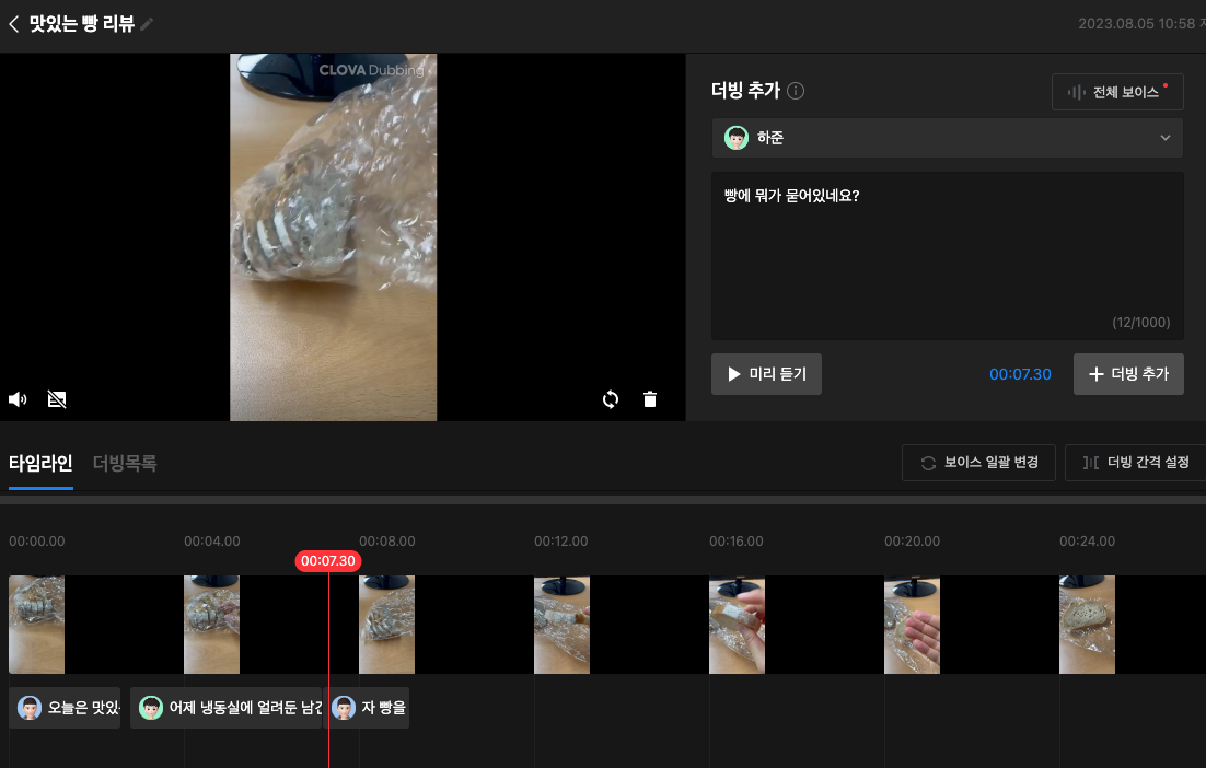 CLOVA Dubbing은 더빙이라는 말에서 알 수 있듯이, 어떤 글을 작성하면 영상을 재생할 때 그 내용을 읽어줍니다. 기존에는 전문 성우 분들이 영어 방송을 진행할 때 자막 대신 한국어로 읽어주었다면, 이제는 AI 목소리 성우들이 텍스트만 입력하면 읽어줄 수도 있는 것입니다. 만약 다른 서비스도 함께 활용한다면, 영어 방송 스크립트를 Papago 번역을 통해 한국어 스크립트로 변환하고, CLOVA Dubbing으로 읽어줄 수도 있겠죠. 이건 저작권 등 문제가 있을 수 있어 다음 컨텐츠에서 한번 적용해보도록 하고, 이번 글에서는 제가 직접 촬영한 빵 리뷰 영상을 사용해보도록 하겠습니다.