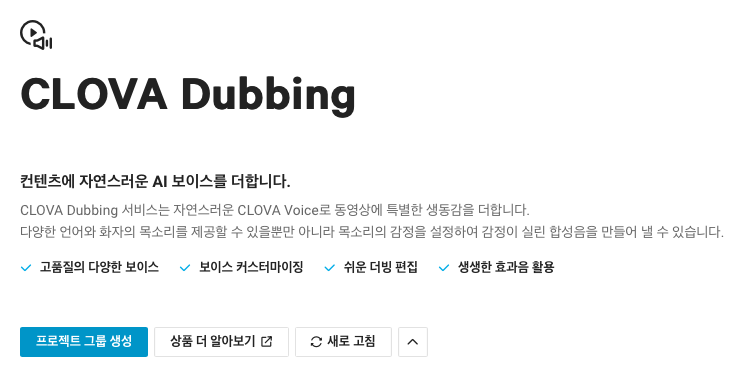 CLOVA Dubbing은 CLOVA Voice의 다양한 목소리를 활용하여 여러 종류의 언어와 감정이 표현된 목소리를 콘텐츠 목적에 맞게 제작할 수 있는 네이버 클라우드 플랫폼의 서비스입니다.