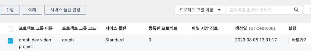 생성 후 아래 화면처럼 나타나고, 수정, 삭제, 서비스 플랜 변경(Standard, premium) 기능이 있습니다. 맨 우측에 있는 실행 > 바로가기를 눌러주세요.