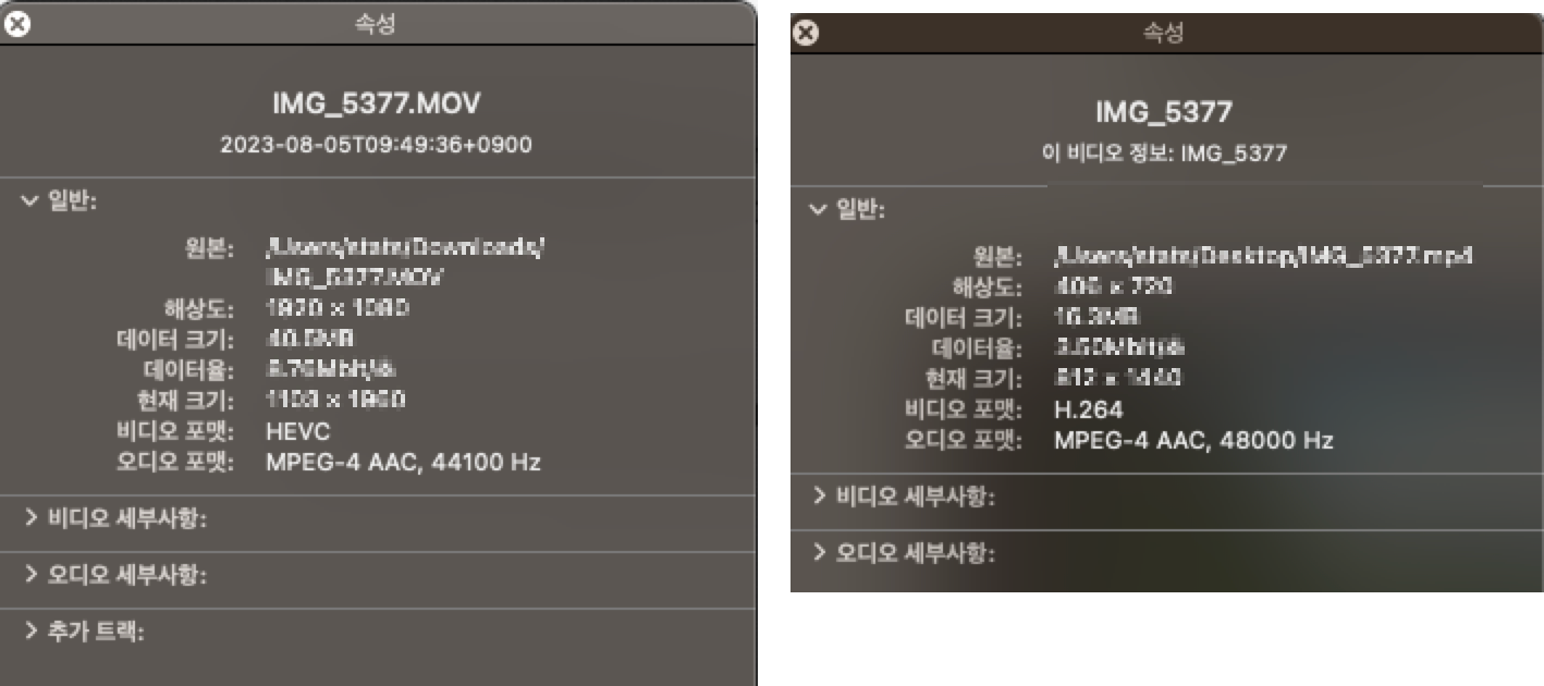 동영상을 추가해보겠습니다. FHD 이하 해상도의 MP4, MOV 형식, 그리고 H.264 코덱을 지원한다고 합니다. 아이폰으로 촬영했을 때 코덱이 달라서 추가가 안되네요. 이럴 때는 당황하지 않고, iMovie로 내보내기 해주면 아래와 같이 비디오 포맷 부분에서 HEVC가 H.264로 변하고, MOV 확장자는 mp4로 변하게 됩니다. 참고해주세요. 변환하고 나서는 바로 업로드 성공했습니다.