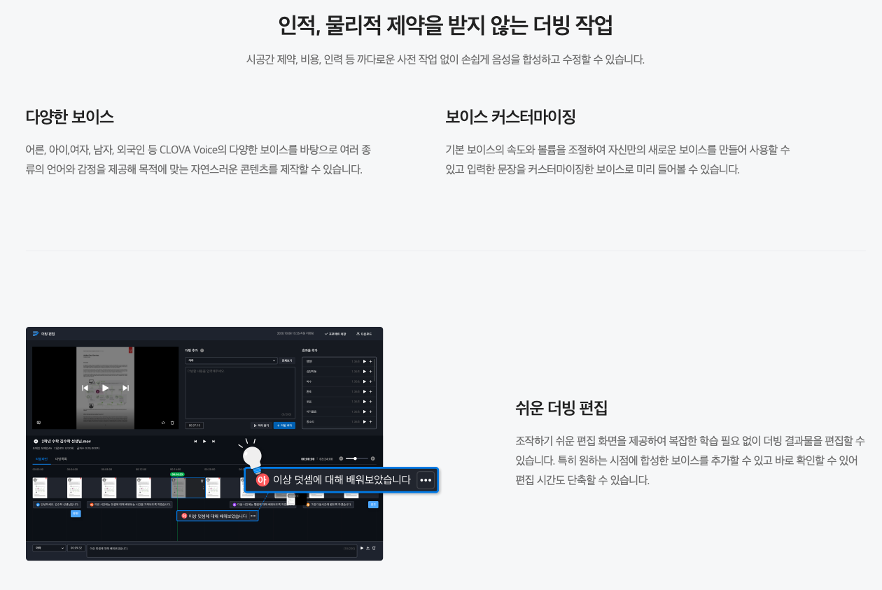 동영상에 보이스를 더하다. 원하는 문장을 입력만 하면 생생한 AI 더빙이 뚝딱.