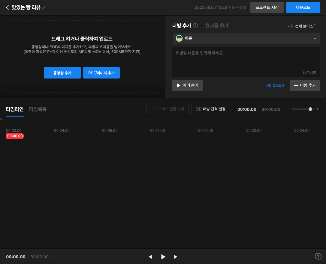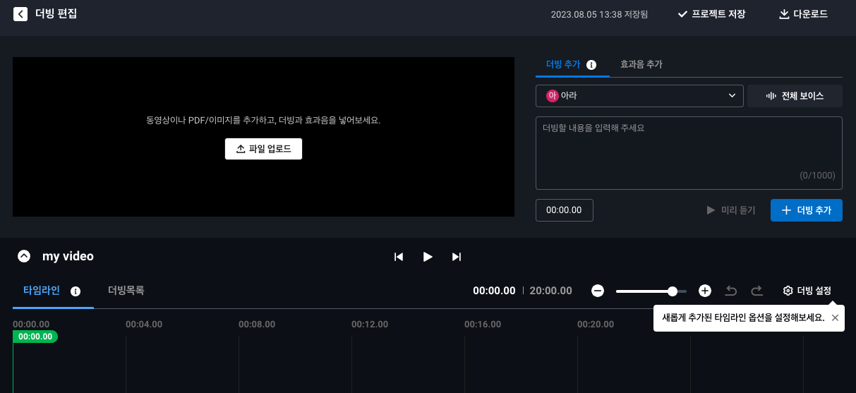 생성하면, 아래와 같은 화면이 나타납니다. 한눈에 봐도 동영상 편집 툴(스튜디오 형)으로 보이시죠? 여기에 더빙과 효과음이 눈에 들어오도록 배치했네요.
