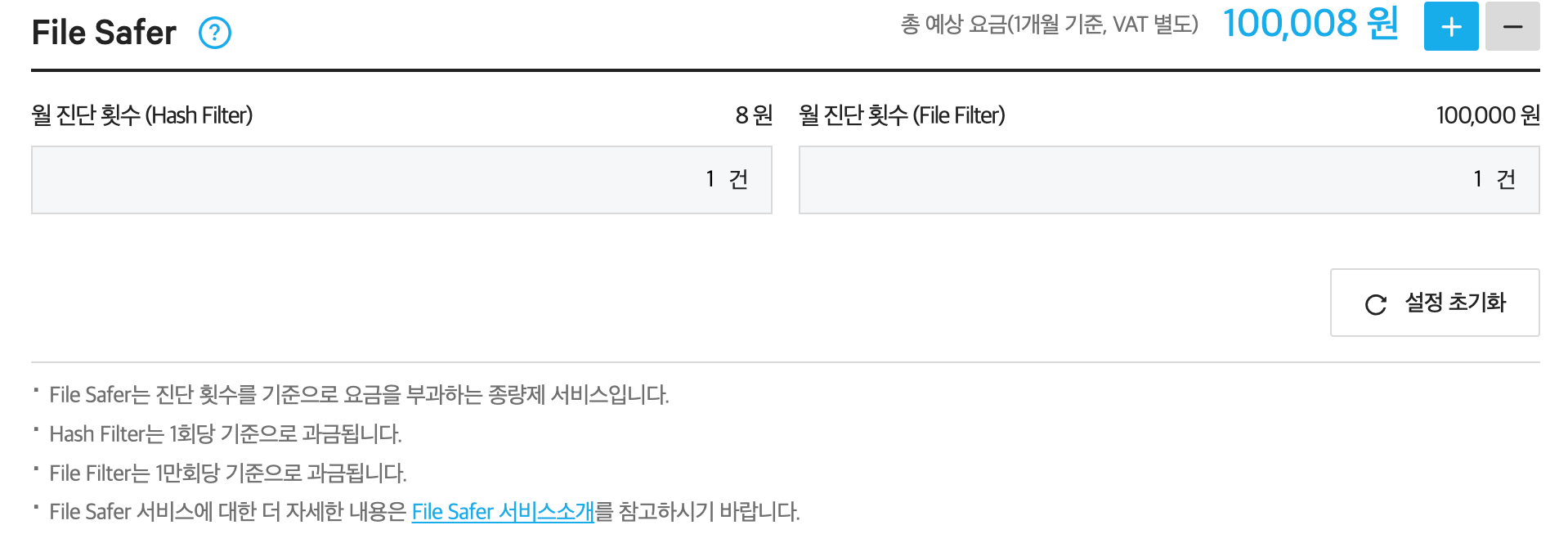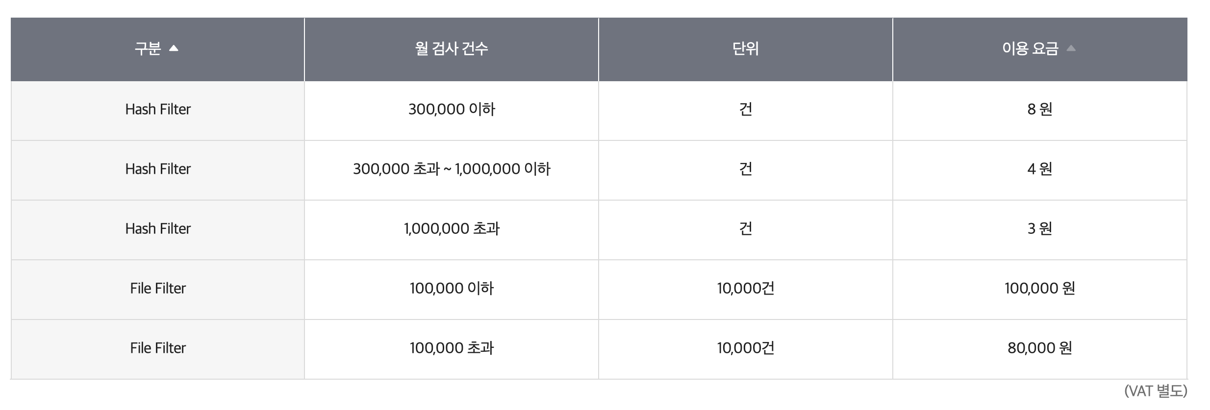 요약하면 Hash Filter는 매월 30만건 이하일 경우, 1건당 8원이 부과되고, File Filter는 매월 10만건 이하일 경우 검사 건수는 1만건을 기준으로 10만원이 들어갑니다. 즉, 대량으로 검사하는 경우에 File Filter도 함께 사용하면 좋다는 거죠.