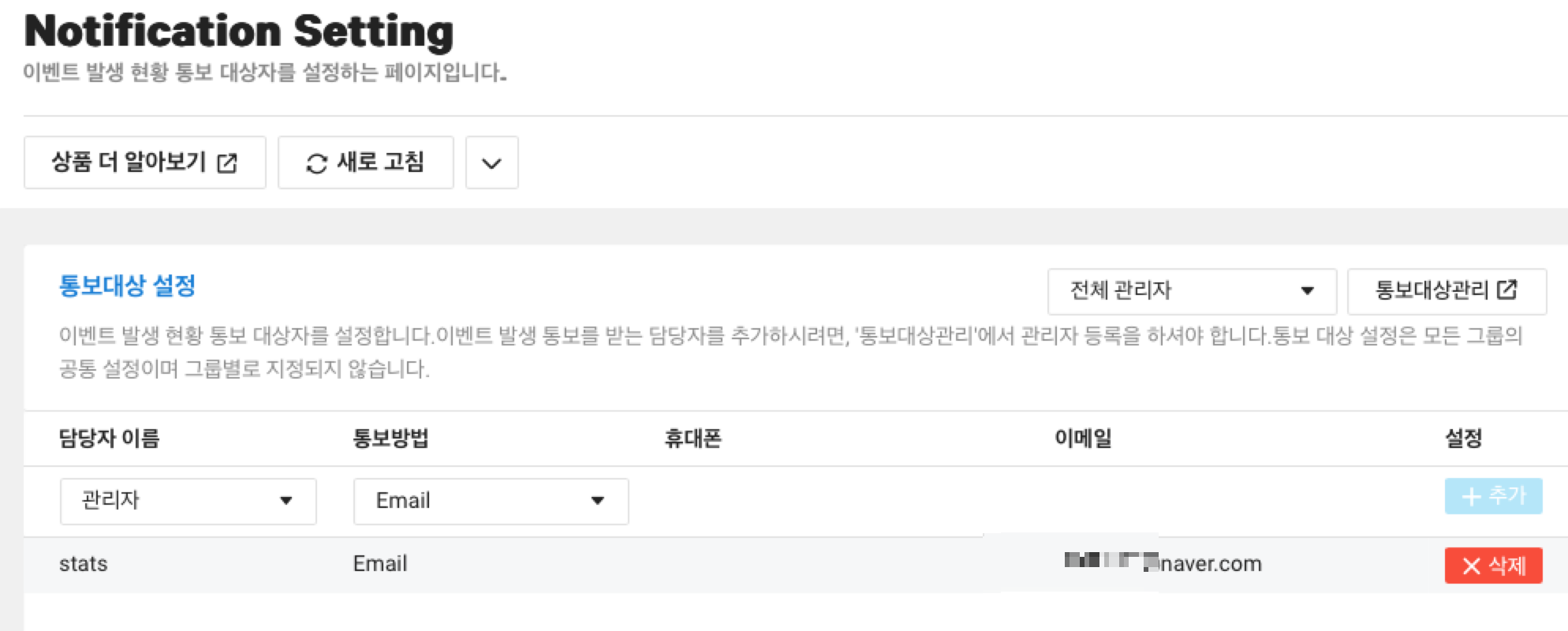 가장 먼저 통보 대상자 설정을 위해 Notification Setting 으로 들어갑니다. 통보대상 설정에서 드롭박스 메뉴로 선택해줍니다. 통보대상자가 없다면 통보대상관리를 눌러서 대상자 정보(Email, 휴대폰번호 등)을 추가해주고 진행해주세요. 저는 이메일만 통보방법으로 선택해보겠습니다.