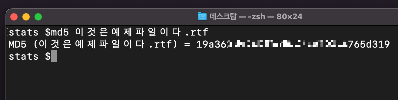 그런데, 파일의 Hash 값은 어떻게 구할 수 있을까요? 저는 Mac OS를 사용하므로, MD5 해시 값을 한번 찾아보겠습니다. 터미널 명령어를 사용해보겠습니다. MAC OS 기준으로 사용할 명령어는 다음과 같습니다.