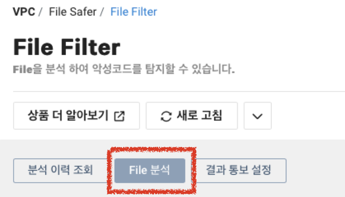 File Filter는 File을 분석해서 악성코드를 탐지하는 서비스입니다. 테스트하는 비용이 비싸지만, 사용하는 법은 알아두면 좋기 때문에, 간단히 콘솔로만 살펴보겠습니다. File Safer > File Filter로 넘어가면 아래와 같은 화면이 나타납니다. File 분석을 눌러줍시다.