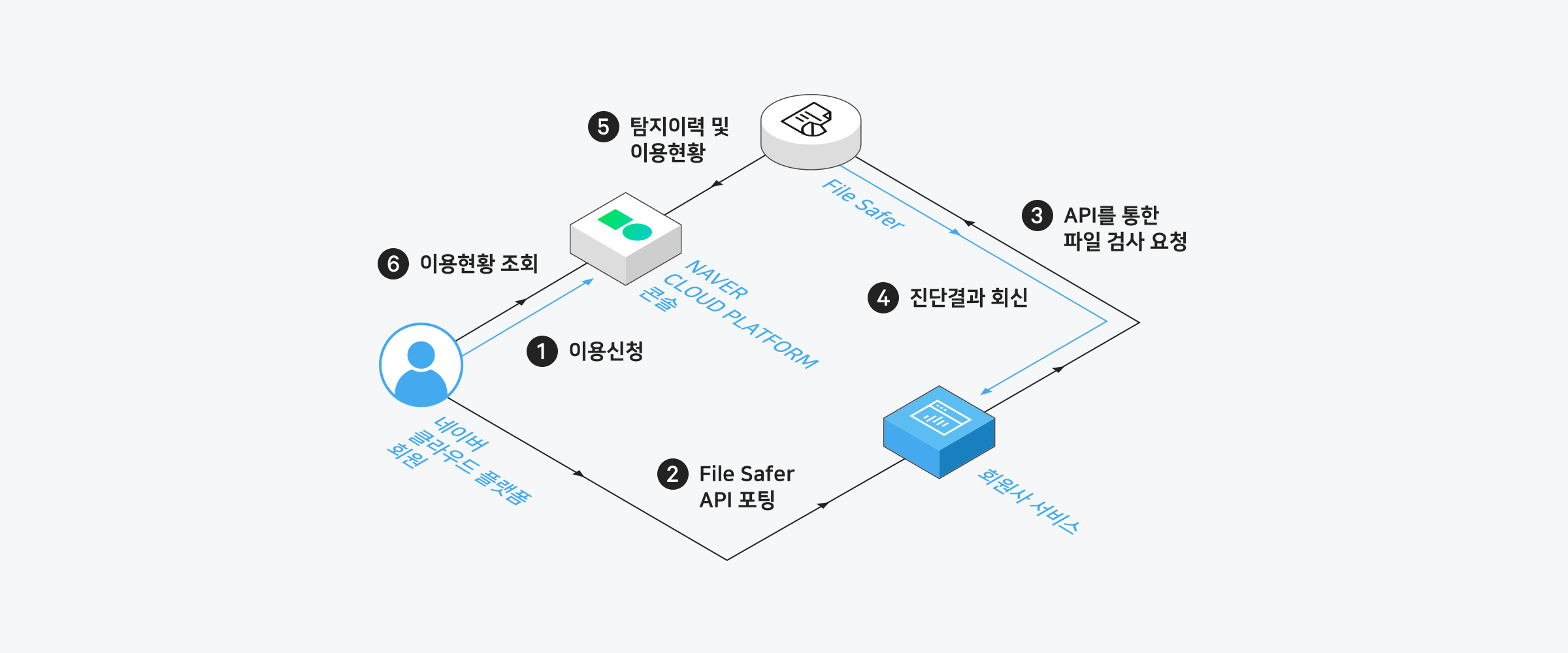 이번에는 이와 관련하여 Ncloud에서 소개하는 악성코드 탐지 시나리오를 살펴보겠습니다. 이용 신청 후, File Safer API를 연결해서 파일 업로드 및 다운로드를 하면 API를 통해 검사 요청 후 진단 결과를 받습니다. 잠시 사이트로 가서 개념과 시나리오만 읽고 오겠습니다.