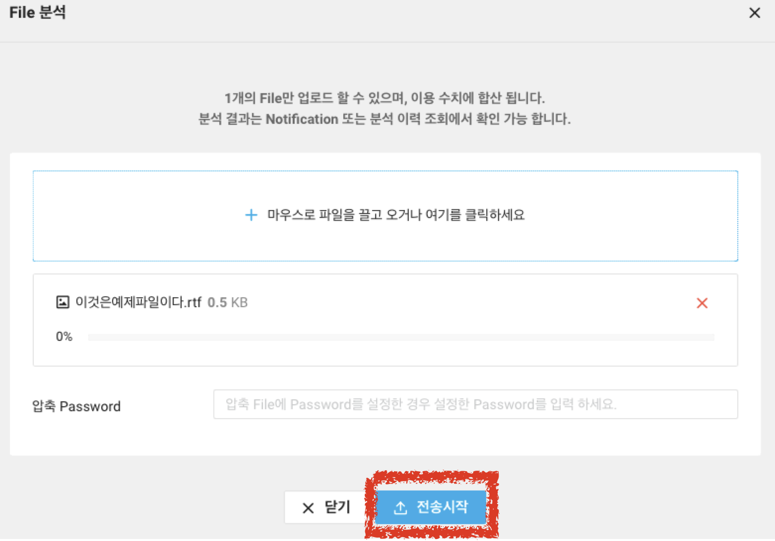 누르면 아래와 같은 창이 나타납니다. 여기서 File 분석에 필요한 파일을 업로드해주시고, "전송시작"을 누르면 분석을 수행합니다. 그리고 암호가 걸린 압축 파일이라면 압축할 때 설정하신 비밀번호를 아래 압축 Password란에 넣어주면 됩니다.