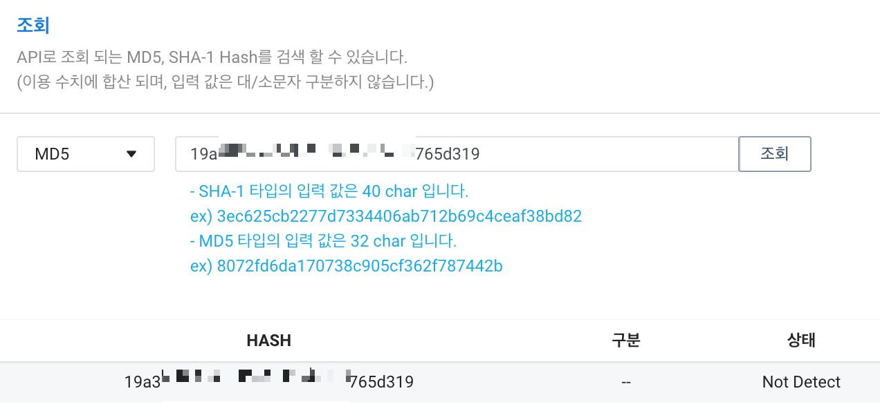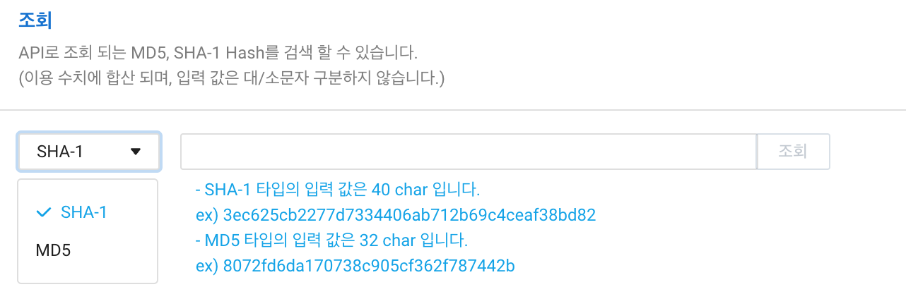 위 콘솔 화면에서 Hash 조회를 눌러줍니다. 그러면 아래와 같은 창이 뜹니다. Hash 알고리즘이 SHA-1, MD5인 경우 드롭박스 메뉴에서 선택하고, 검사하고자 하는 Hash 값을 알고리즘에 맞게 입력하고 조회를 누르면 됩니다.
