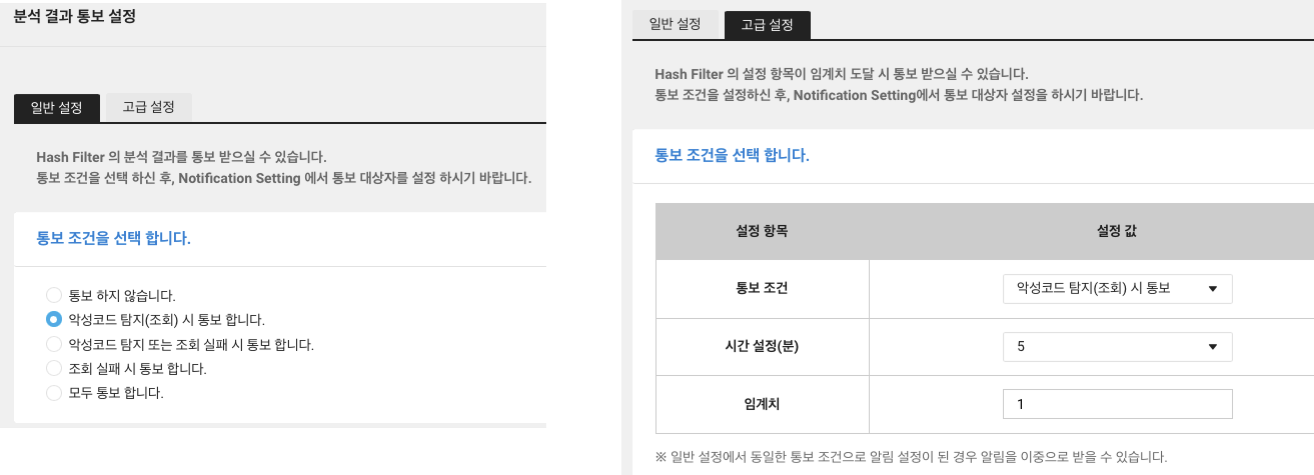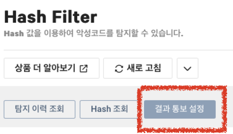 File Safer > Hash Filter로 들어가서 결과 통보 설정 버튼을 누릅니다.