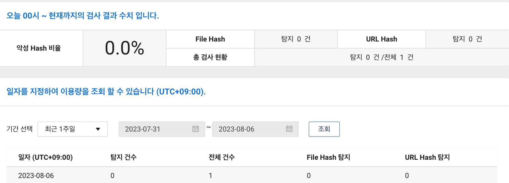 이렇게 Hash 조회를 마쳤고 8원(1건 기준)이 부과될 예정입니다. 상태는 Not Detect로 감지되지 않았다고 결과가 아래 회색 칸에 나타납니다. 다시 탐지 이력을 조회해보겠습니다. 이제 전체건수가 0건에서 1건으로 늘어났습니다.
