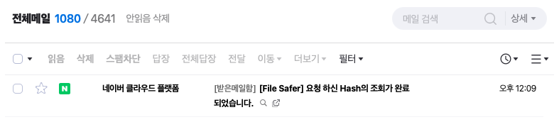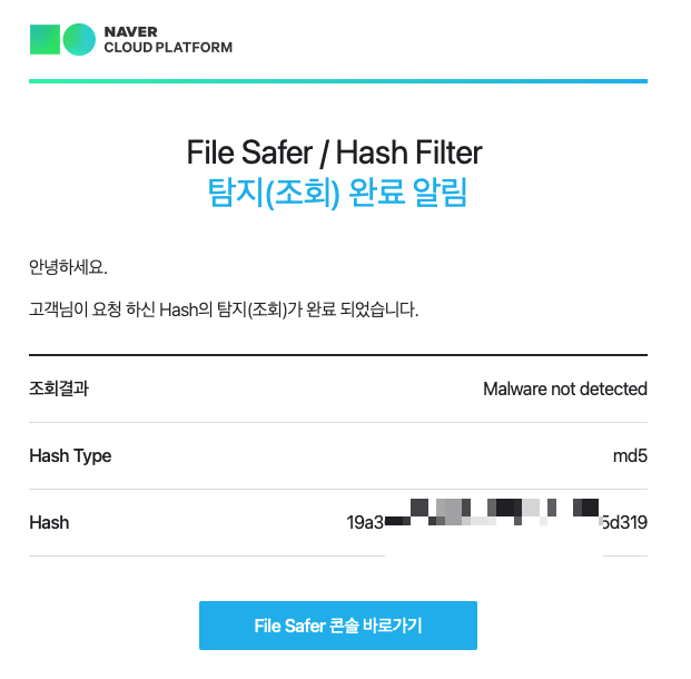 위의 화면처럼 잘 메일 알림이 왔고 상세 내용에 Hash Type, Hash 값을 함께 알려주고 있습니다. 이를 잘 활용하면 자동 검사를 실시할 때 알림을 받고 잘 대응할 수 있겠네요.