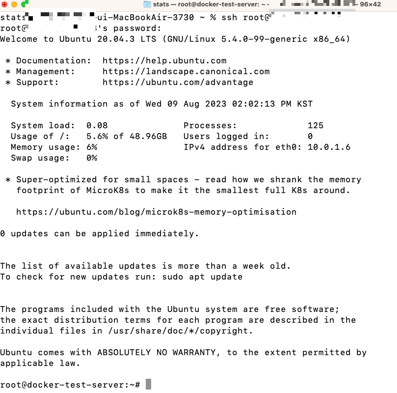 서버 이름을 우리가 docker-test-server로 설정했습니다. 접속해보겠습니다. 저는 ssh 명령어로 접속하겠습니다. 공인 아이피를 활용해서 접속합니다.
