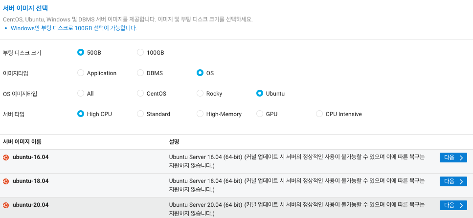 대부분 옵션은 디폴트로 두고, OS 이미지 타입은 Ubuntu로 설정하고, 서버 이미지 이름에 ubuntu-20.04로 선택하고 다음을 누릅니다.