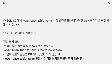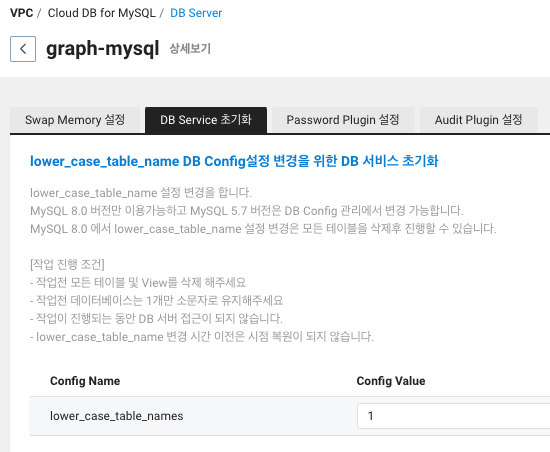 추가로 하나 더 수행할 것이 있습니다. DB 서버 > DB 관리 > DB Service 초기화를 누릅니다. DB Service 초기화 탭에서 Config Name 중 lower_case_table_names에 해당하는 Config Value를 0에서 1로 변경하겠습니다.