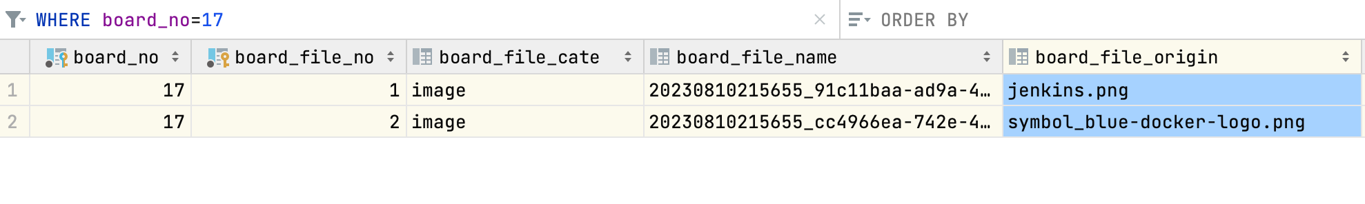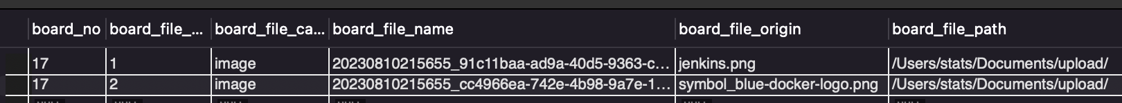 다음은 MySQLWorkbench를 사용해서 확인해보겠습니다. 경로에 해당하는 스키마로 접속해서, 마찬가지로 t_board_file 테이블을 확인해보겠습니다. board_file_origin에 두 이미지 파일이 잘 들어가 있습니다. 이제 실제 경로로 들어가서 파일이 있는지 확인하겠습니다.