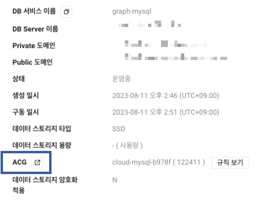 그리고 3306 포트를 ACG에서 열어주겠습니다. 아래 ACG 우측 버튼을 누르면 ACG 화면으로 넘어갑니다.