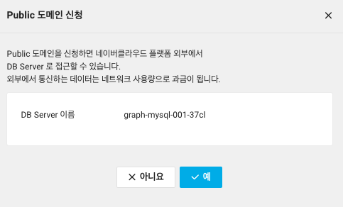 서버 생성이 완료되어 운영중으로 표기되면 다음 작업으로 넘어가겠습니다. 먼저 외부 접근을 위해서는 public 도메인을 신청해서 할당받아야 합니다. DB 관리 > Public 도메인 관리로 들어가서, 아래와 같이 Public 도메인 신청을 진행합니다.