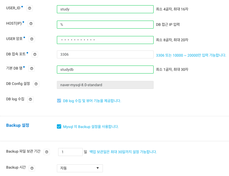 위와 같이 작성하고, DB Server는 호스트명의 중복을 방지하는 것도 알아두면 좋겠습니다. DB 서비스는 자유롭게 설정하시면 되고, HOST(IP)는 %로 모두 허용하고 빠르게 진행하겠습니다.
