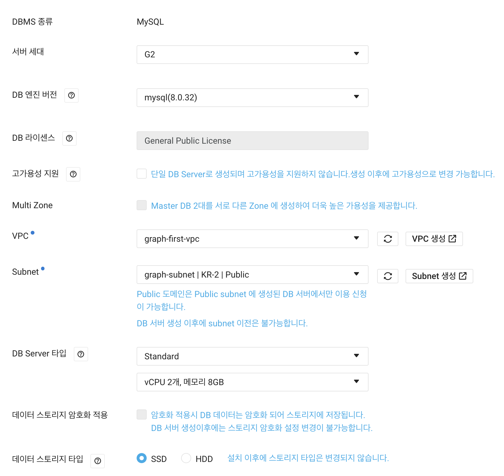 Ncloud 콘솔에서, Database > Cloud DB for MySQL을 선택하고, DB Server를 선택합니다. DB Server 생성을 하고 아래와 같이 입력하겠습니다. VPC는 기존에 만든 것을 사용하고, 고가용성은 체크하지 않았습니다. 단일 DB 서버로 우선 진행하고, 차후 필요하다면 변경도 가능하다고 하니 필요하신 분은 그때 수정하셔도 되겠습니다.