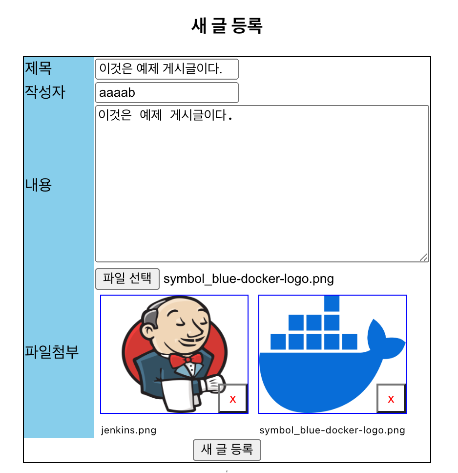 아래는 Spring Boot와 React를 활용해서 만든 게시판 앱입니다. 먼저 두가지 이미지파일을 선택하고, 새 글 등록 버튼을 눌러보겠습니다.