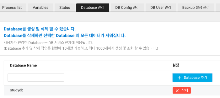 이후에는 다시 설정중이며, 운영중으로 DB 서버가 바뀌면 아래 작업을 수행하겠습니다. 먼저 DB Server 상세보기 > Database 관리에서, studydb라는 데이터베이스를 추가하고 저장 버튼을 누릅니다.